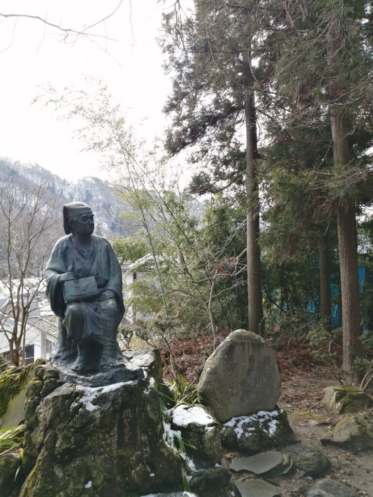 芭蕉さん。隣には芭蕉の旅の同行人曾良(そら)像もありました。