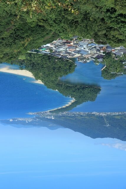 まず、天橋立傘松公園から「股のぞき」すると、天橋立が天に架かる橋のように見えます。これが「天橋立」の由来といわれているんですよ。