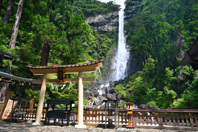 滝と神社と深い森が一体となった絶景は、まさにインスタ映え。